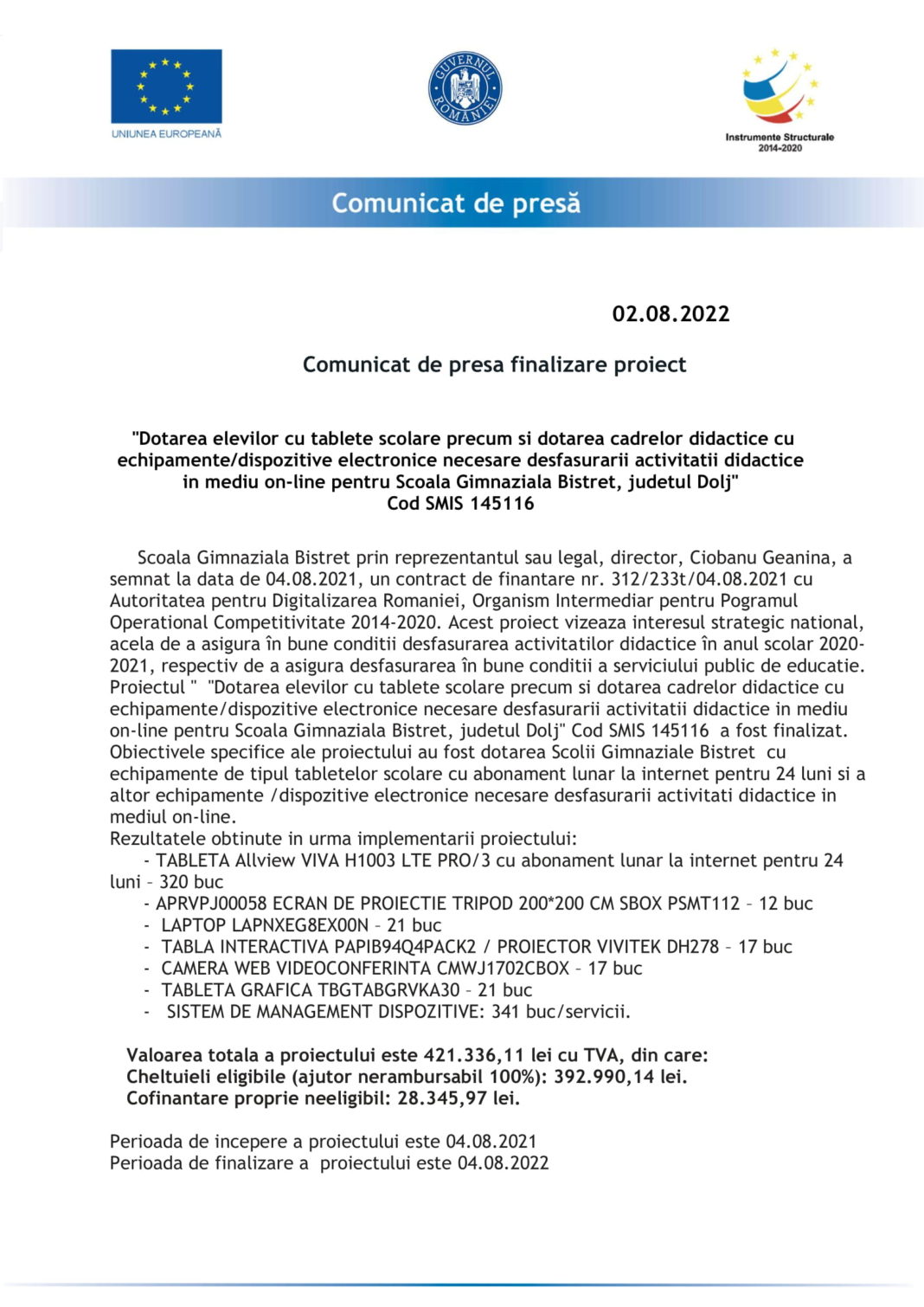 Comunicat de presa finalizare proiect Scoala Gimnaziala Bistret