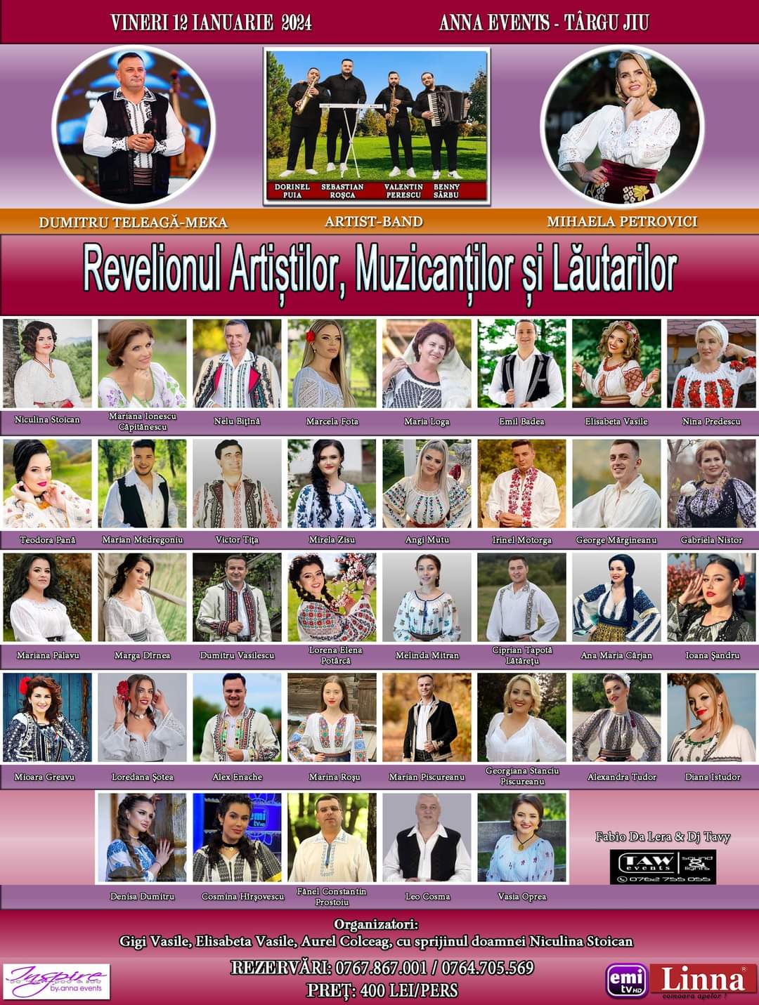 Revelionul Artiștilor și Muzicanților va avea loc vineri, 12 ianuarie, la Târgu Jiu. Evenimentul se află la cea de-a 14-a ediție și va fi găzduit de Restaurantul Anna Events din municipiu. Atmosfera va fi întreținută de Mihaela Petrovici, Dumitru Telega-Mecka și Formația Artist Band (Dorinel Puia, Benny Sârbu, Sebastian Roșca și Valentin Perescu). Artiștii care participă la eveniment achită un preț de 400 de lei de persoană. Înscrierile au început deja, iar locurile sunt limitate. Sute de interpreți și instrumentiști participă, la începutul anului, la Revelionul artiștilor. Aceasta pentru că toți au lucrat la cumpăna dintre ani.