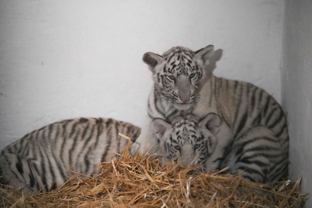 În Gradina zoologică din Parcul Romanescu au fost aduși doi pui de tigru alb, în vârstă de 4 luni. Începând din weekendul viitor vor putea ieși în țarc, la plimbare. Ei sunt hrăniți de medicul veterinar cu lapte și par a fi în stare perfectă de sănătate .