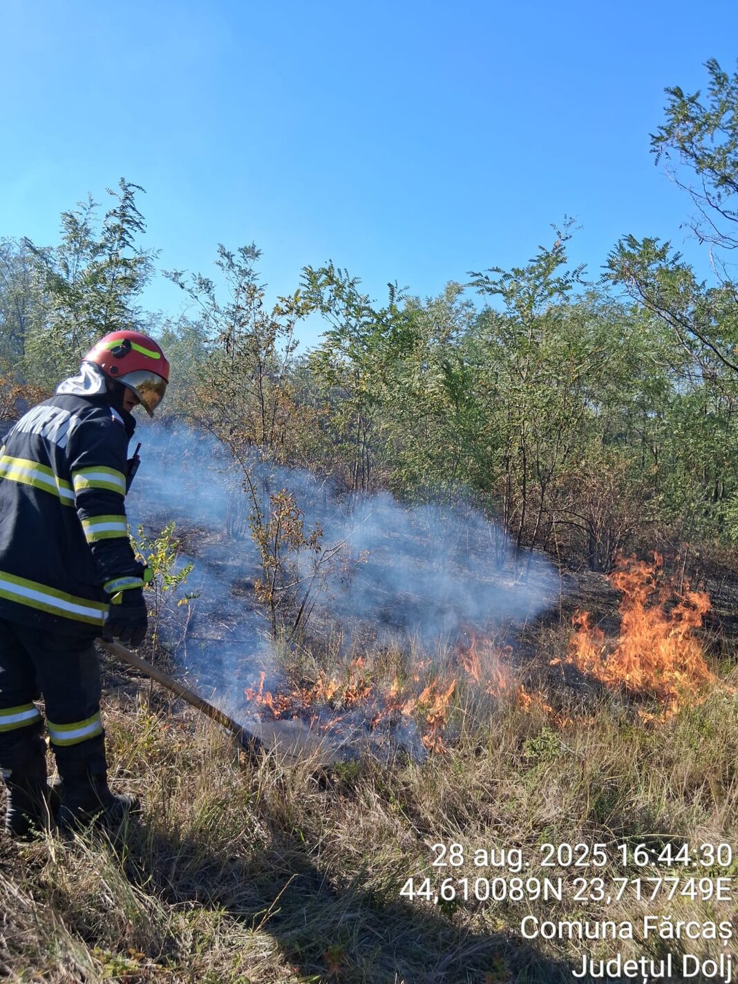 Punctul de Lucru Filiași intervine la un incendiu, tot de vegetatie uscată, în suprafață de aproximativ 30 ha. Se lucrează pentru lichidarea focarelor. Se deplasează în sprijin o autospecială de la Secția de Pompieri Craiova.