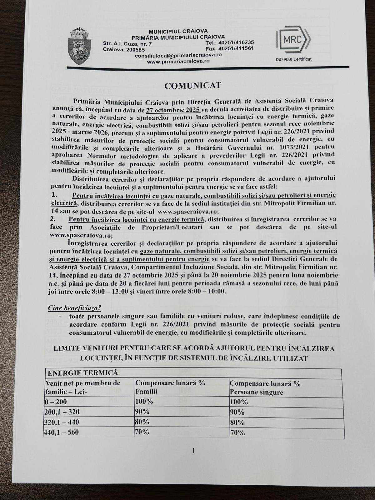 Craiovenii care beneficiază de ajutor pentru încălzirea locuinței pot ridica începând cu 26 octombrie 2025, declarație pe propria răspundere pentru acordarea ajutorului pentru încălzirea locuinței și a suplimentului pentru energie pentru sezonul 2025-2026 de la Direcția de Asistență Socială Craiova.