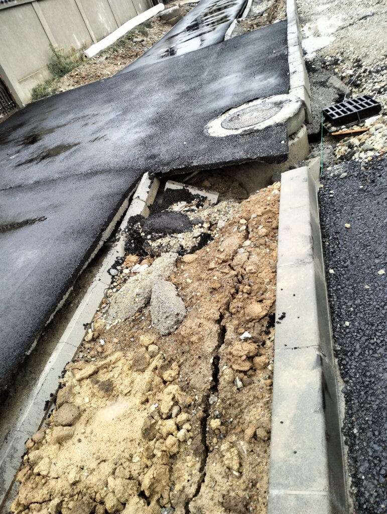 Ploile căzute în ultima perioadă au înmuita pământul, iar asfaltul, acolo unde a fost turnat, fie că este vorba despre trotuare sau carosabil, s-a rupt în două. La fel s-a întâmplat și pe zonele neasfaltate, pământul pare că a fost înghițit de caverne nevăzute, în urmă, rămând adevărate cratere. Trotuarele și bordurile au rămas în aer, iar pământul de sub ele pare înghițit de un hău fără fund. Lucrările sunt compromise din moment ce capacele de la canalizare și geigerele sunt și ele înghițite de nămolul de pe marele bulevard. Localnicii spun că imaginile par desprinse dintr-un scenariu de groază. „Este un dezastru. S-au făcut gropi mari, atât pe strada asfaltată cât și pe trotuare și căile de acces în curți. Unii au fost nevoiți să le umple cu pietriș ca să poată ieși din curte. Mergeți cu grijă, este o denivelare foarte adâncă, cam pe la jumătatea străzii “, spune un localnic.