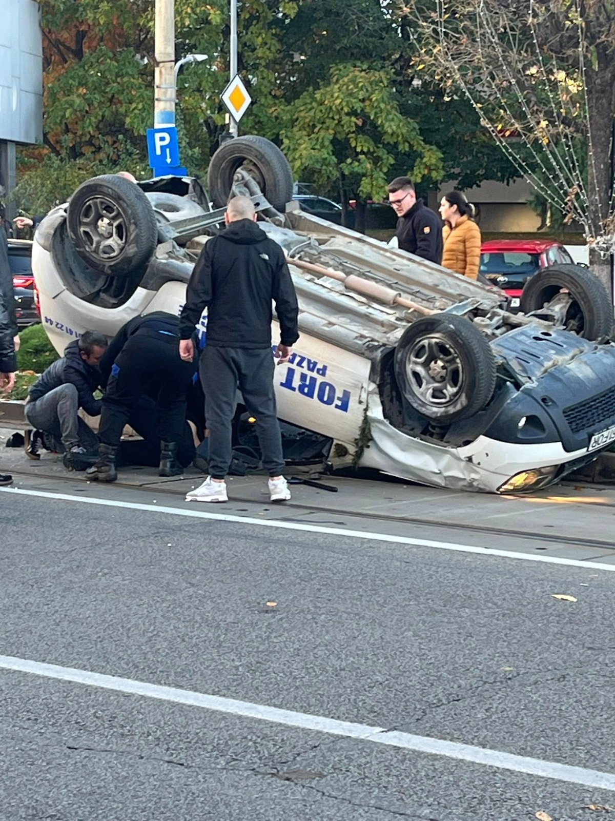 O mașină s-a răsturnat, parțial pe șinele de tramvai, parțial pe scuar.