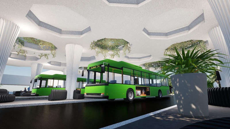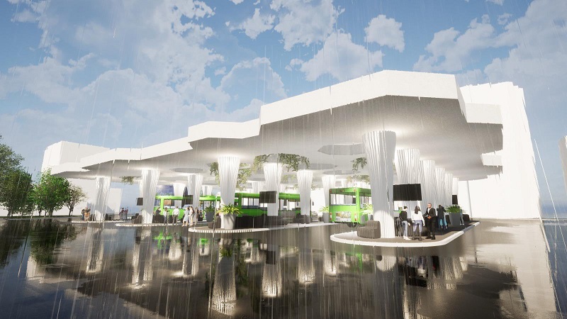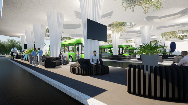 Cu alte cuvinte, zona de staționare actuală a autobuzelor va fi acoperită cu o structură metalică deschisă, îmbracată în material compozit alb. În învelitoare vor fi lăsate ochiuri libere pentru iluminarea naturala. Pentru călători vor fi realizate băncuțe din material compozit cu aspect de lemn, de tip lamelar serpuit. În partea dinspre bulevardul Dacia va fi amplasată o sferă metalică, ca un glob pământesc, pe care va fi reprezentată harta Craiovei. Fântâna arteziană va fi refăcută complet, înconjurată fiind de tot felul de elemente de decor, respectiv patru forme tip cristale, unele tip ou de rață. În zonă vor fi plantați palmieri și liane.