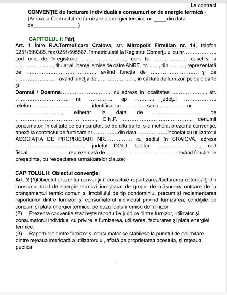 Unii reprezentanți ai asociațiilor de proprietari din Craiova pledează pentru încheierea de convenții individuale între locatari și furnizorii de utilități, în speță Compania de Apă Oltenia și Termo Urban. Astel de contracte se pot încheia mai ușor cu operatorul de apă și canal, dar mai greu cu cel de căldură. Craiovenii sunt reticenți, spun că, atât timp cât consumul nu este individualizat nu se pot încheia contracte individuale.