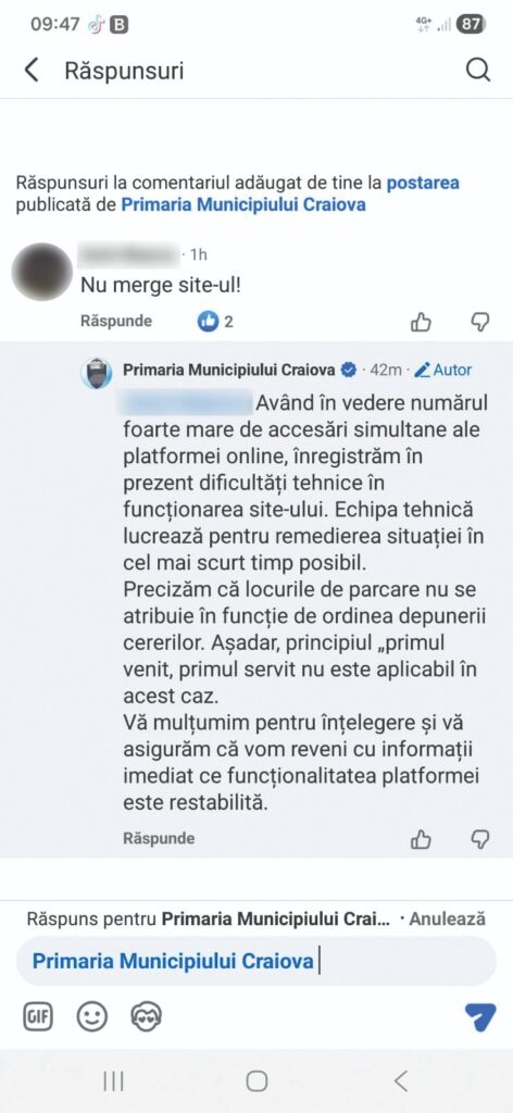 Craiovenii care au încercat să acceseze situl la prima oră a dimineţii au primit următorul mesaj. „Având în vedere numărul foarte mare de accesări simultane ale platformei online, înregistrăm în prezent dificultăți tehnice în funcționarea sitului. Echipa tehnică lucrează. pentru remedierea situației în cel mai scurt timp posibil. Precizăm că locurile de parcare nu se atribuie în funcție de ordinea depunerii cererilor. Așadar, principiul primul venit, primul servit nu este aplicabil în acest caz. Vă mulțumim pentru înțelegere și vă asigurăm că vom reveni cu informații imediat ce funcționalitatea platformei este restabilită”, se arată în răspunsul, probabil automat al sitului, trimis unui craiovean.
