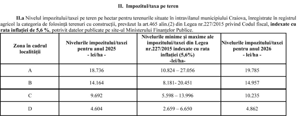 „Pentru anul fiscal 2026, impozitele pe clădiri, pe teren și pe mijloacele de transport se vor stabili prin aplicarea nivelurilor prevăzute în mod expres la pct. 27, 39, 43, 44 din Legea nr.239/15.12.2025 privind stabilirea unor măsuri de redresare și eficientizare a resurselor publice și pentru modificarea și completarea unor acte normative. În perioada de transparență decizională au fost primite propuneri din partea cetățenilor municipiului Craiova care au fost însușite de compartimentele de specialitate și sunt înaintate spre aprobare Consiliului Local, acestea vizând următoarele aspecte:
