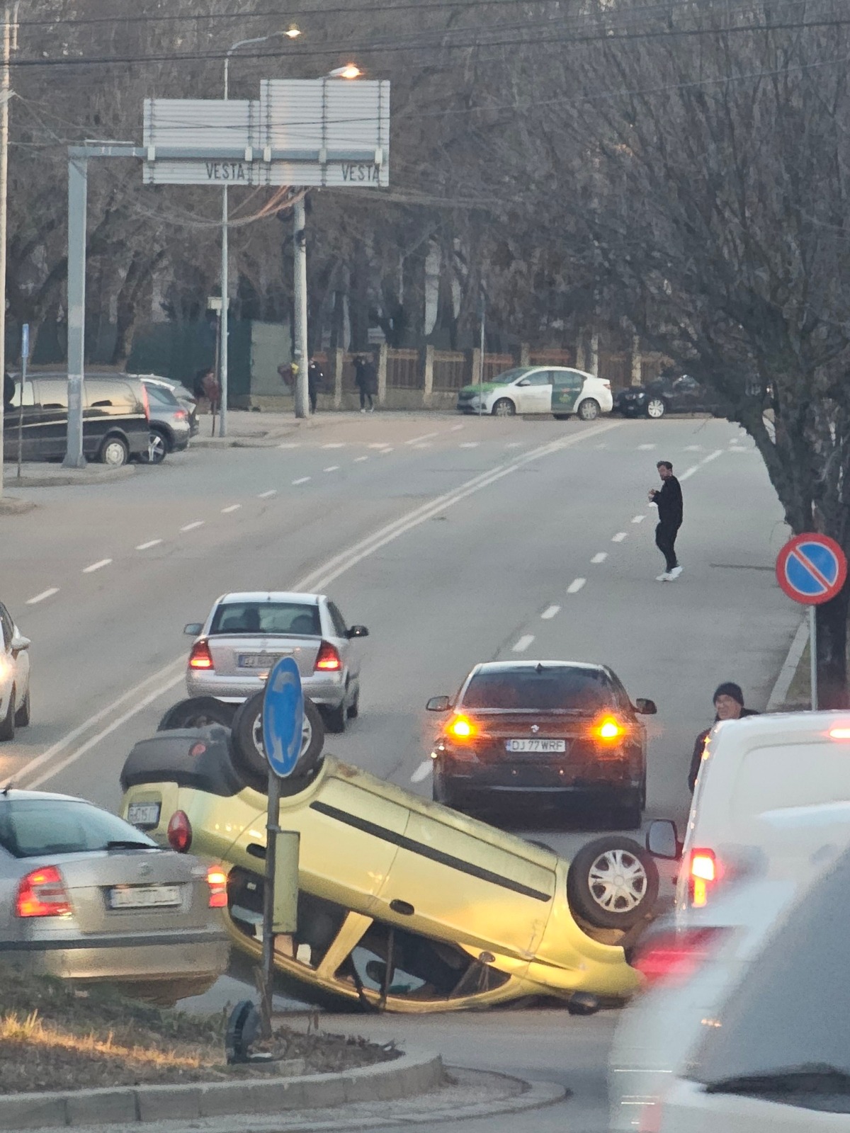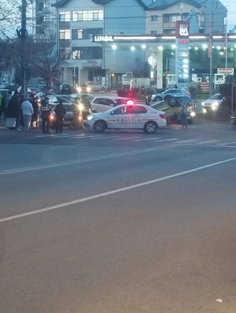 Un șofer s-a răsturnat cu mașina în această după-amiază, în sensul giratoriu de la Consul, între cartierul Brazda lui Novac și zona Cornițoiu.