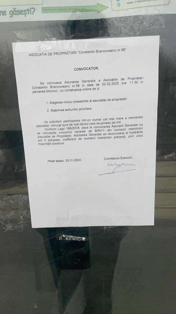 Legea în domeniu spune că adunările se țin în primele trei luni ale anului. Prin urmare, martie este ultima lună. “După constituirea asociației de proprietari va avea loc cel puțin o dată pe an, în primul trimestru, o întrunire a adunării generale a asociației de proprietari. Responsabilitatea cu privire la convocarea anuală a cel puțin unei adunări generale a asociației de proprietari aparține președintelui asociației de proprietari și membrilor comitetului executiv”, se precizează în art.47/Legea 196/2018. În ciuda faptului că stau de ani buni la bloc, mulți proprietari tot nu au înţeles condiţiile care trebuie întrunite pentru convocarea/reconvocarea adunărilor generale. Responsabilitatea cu privire la convocarea anuală a cel puțin unei adunări generale a asociației de proprietari aparține președintelui asociației de proprietari și membrilor comitetului executiv.