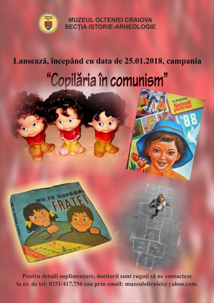 Muzeul Olteniei Craiova, Secţia de Istorie-Arheologie, lansează, începând cu data de 25 ianuarie, Campania “Copilăria în comunism”, prin intermediul căreia invită doljenii să doneze sau să împrumute temporar instituției muzeale obiecte din perioada comunistă (1948-1989), în scopul îmbogăţirii patrimoniului cultural muzeal local cu piese relevante şi amenajării unei expoziții temporare în care să fie reconstituită, într-o manieră cât mai fidelă, atmosfera copilăriei din perioada comunistă.