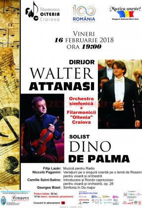 Orchestra Simfonică a Filarmonicii “Oltenia” Craiova prezintă vineri, 16 februarie 2018, ora 19:00, un concert de virtuozitate, Paganini/Saint-Saëns, sub conducerea muzicală a dirijorului Walter Attanasi, cu participarea solistului Dino de Palma. Cei doi muzicieni italieni aduc pe scenă un program de legendă care spune că Paganini, aflat în temniţă, a rupt trei corzi ale viorii în semn de protest, fiind nevoit să cânte pe una singură. Aşa s-ar fi născut lucrarea Variaţiuni pe o singură coardă pe o temă de Rossini, care impune interpretului să utilizeze o singură coardă pe tot parcursul desfăşurării ei.