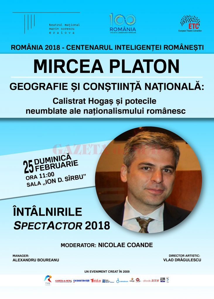 Istoricul Mircea Platon este invitatul lui Nicolae Coande la Întâlnirile SpectActor din data de 25 februarie, programată de la ora 11.00 la sala „Ion D. Sîrbu” a Teatrului Naţional „Marin Sorescu” din Craiova. Evenimentul cultural își propune să aducă în fața publicului craiovean personalități ale culturii naționale și europene, capabile să dezvolte un dialog pe coordonatele spiritului tolerant și ale ideii incisive. Mircea Platon va susține conferința „Geografie și conștiință națională: Calistrat Hogaș și potecile neumblate ale naționalismului românesc”.