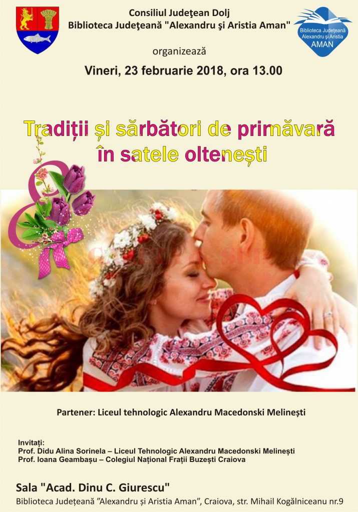 Biblioteca Județeană “Alexandru si Aristia Aman” alături de Liceul Tehnologic “Alexandru Macedonski” Melinești organizează vineri, 23.02.2018, începând cu ora 13.00, în sala “Acad. Dinu C. Giurescu” activitatea cu titlul “Tradiții și sărbători de primavară în satele oltenești”.