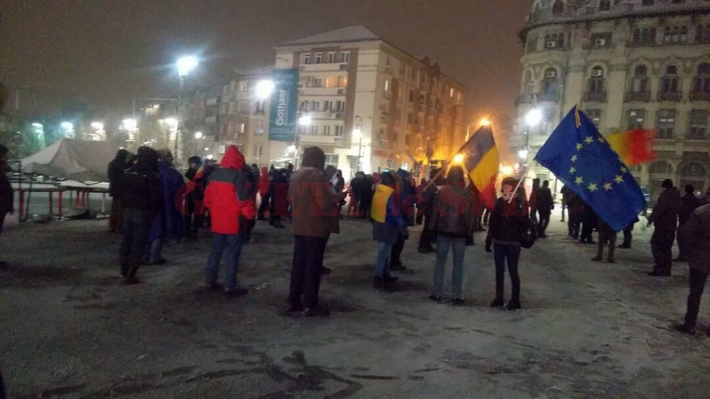 Protestatarii, care înfruntă un frig teribil, scandează ”DNA sa vina să vă ia!”, ”Nu vrem sa fim o nație de hoți!”, ”Tudorel, nu uita/Așteptăm demisia!”, ”Guvern de hoți și de mafioti!”.