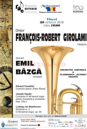 Renumitul trompetist Emil Bâzgă revine pe scena Filarmonicii „Oltenia” din Craiova, în cadrul Stagiunii „Muzica uneşte!” Concertul în care acesta va fi prezent (Haydn/Beetoven) are loc vineri, 20 aprilie, de la ora 19.00.