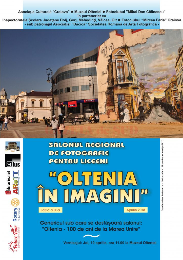La sediul Muzeului Olteniei, Sala ”Ștefan Ciuceanu”, va avea loc, mâine, de la ora 11.00, festivitatea de premiere și vernisajul Salonului Regional de Fotografie Oltenia în Imagini, continuatorul Salonului Municipal de Fotografie Craiova în Imagini. Salonul este organizat de Asociaţia Culturală “Craiova” și Muzeul Olteniei, în colaborare cu Fotoclubul “Mihai Dan Călinescu”, Inspectoratele Şcolare Judeţene Dolj, Gorj, Mehedinți, Vâlcea, Fotoclubul ”Mircea Faria” şi se desfăşoară sub patronajul Asociaţiei ”DACICA” Societatea Română de Artă Fotografică. Salonul este destinat tuturor elevilor de liceu din Oltenia, din clasele IX-XII, pasionaţi de fotografie. Salonul are anul acesta ca temă ”Oltenia – 100 de ani de la Marea Unire”, lucrările oferind o imagine a regiunii la un secol de la acest eveniment istoric care a marcat destinul națiunii. Au fost primite fotografii din întreaga Oltenie care s-au încadrat tematic în genurile artei: reportaj, portret, peisaj urban, sport, ceremonii cultural-artistice, fotografie de stradă, aspecte legate de viaţa cotidiană a elevilor. Juriul este format din Mircea Anghel, artist fotograf, A.FIAP, Hon.FICS (Preşedinte al Fotoclubului „Mihai Dan-Călinescu” din Craiova) – președinte, Cristi Nedelcu – directorul Salonului, Viorel Pîrligras, grafician, și Dorian Delureanu, artist fotograf, preşedinte al Fotoclubului „Mircea Faria” Craiova. În urma deliberării, juriul a decis ca în salon să intre 60 de fotografii, și a stabilit următoarele premii care vor fi decernate joi.