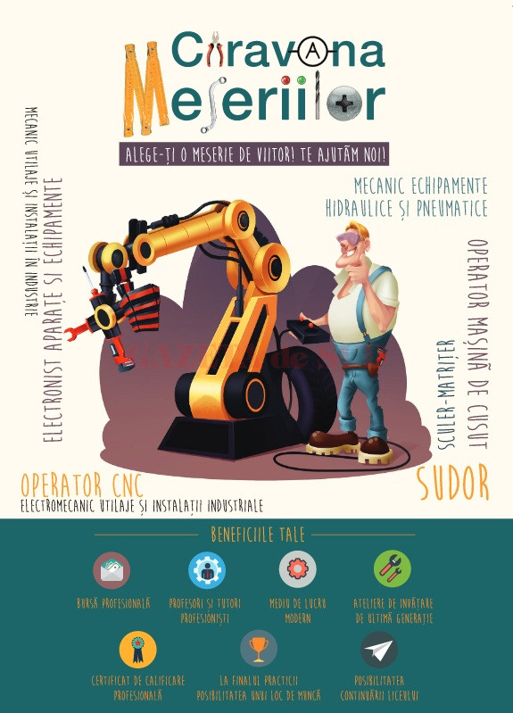 Specificul CARAVANEI este că aceasta va beneficia de stații de lucru mobile, astfel încât elevii vor putea testa ce înseamnă să fii, de exemplu, operator la mașini cu comandă numerică (CNC), sudor sau electronist.