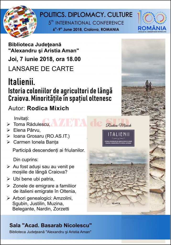 Biblioteca Judeţeană „Alexandru și Aristia Aman” organizează, joi, 7 iunie 2018, începând cu ora 18:00, în sala “Acad. Dinu C. Giurescu”, lansarea volumului “Italienii. Istoria coloniilor de agricultori de lângă Craiova. Minoritățile în spațiul oltenesc”, autor Rodica Mixich.