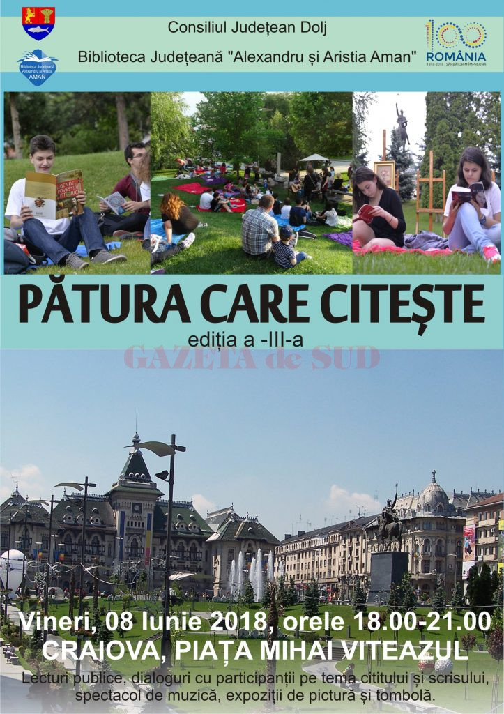 Biblioteca Judeţeană „Alexandru și Aristia Aman” organizează, vineri, 8 iunie, începând cu ora 18:00, în Craiova, în părculețul de lângă Piața „Mihai Viteazul”, „Pătura care citeşte”. Proiectul a fost lansat la Timișoara în 2013, de Biblioteca Județeană „Sorin Titel”, instituție care deține și marca înregistrată, iar din 2015 s-a desfășurat și la Craiova.