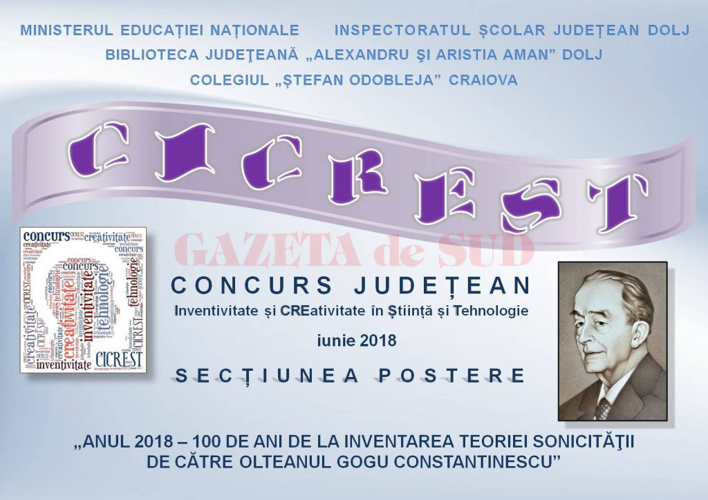 Anul acesta (2018) se implinește un veac de la emiterea Teoriei sonicităţii de către Gogu (George) Constantinescu. Posterele au fost realizate de elevii care au participat la Concursul Școlar Județean de Inventivitate şi Creativitate în Ştiinţă şi Tehnologie – CICREST, organizat și desfășurat în luna iunie 2018 de Colegiul Național „Ștefan Odobleja” din Craiova, in colaborare cu Biblioteca Judeţeană „Alexandru şi Aristia Aman”, Asociaţia Generală a Inginerilor din România – Sucursala Dolj, Inspectoratul Şcolar Judeţean Dolj și Casa Corpului Didactic Dolj.