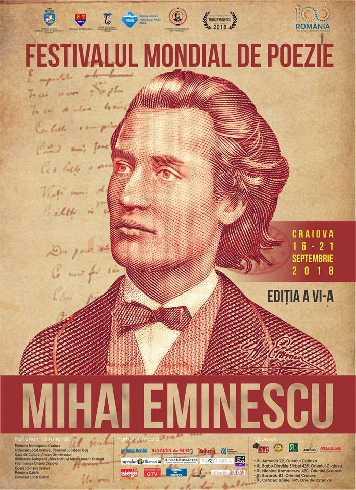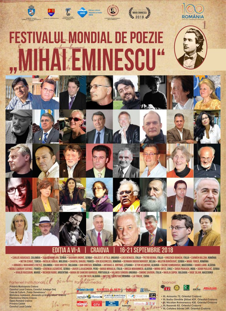 Poeții invitați la cea de-a VI-a ediție a Festivalului Mondial de Poezie „Mihai Eminescu“ (16-21 septembrie 2018), dedicată Marii Uniri de la 1918, au privilegiul să fie prezenți la Craiova, într-un moment aniversar, cu o profundă reverberație istorică și astfel împreună vom cinsti prin intermediul cuvântului acest timp magic, cu răsfrângeri de lumină desferecată și cu speranțe în zorii bucuriei adevărate.