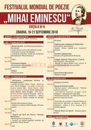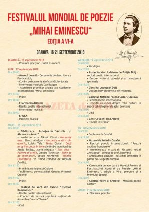 Craiova va fi gazda Festivalului Mondial de Poezie „Mihai Eminescu”, ce se va derula în perioada 16 – 21 septembrie. De asemnea, va avea loc şi decernarea Premiilor anuale ale Academiei Internationale Mihai Eminescu.