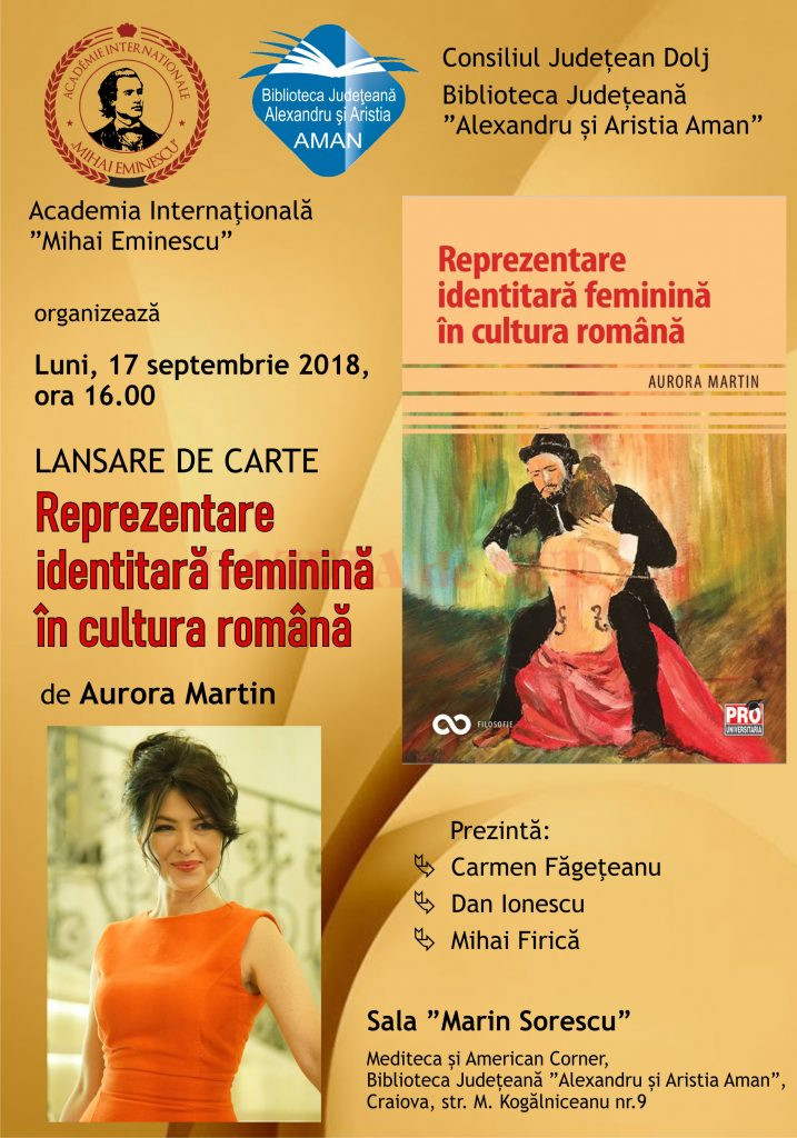 Biblioteca Județeană „Alexandru și Aristia Aman” găzduiește, astăzi începând cu ora 16.00, în sala „Marin Sorescu”, lansarea volumului „Reprezentarea identitară feminină în cultura română”, autor Aurora Martin. La eveniment vor participa: Carmen Făgețeanu, Dan Ionescu şi Mihai Firică.