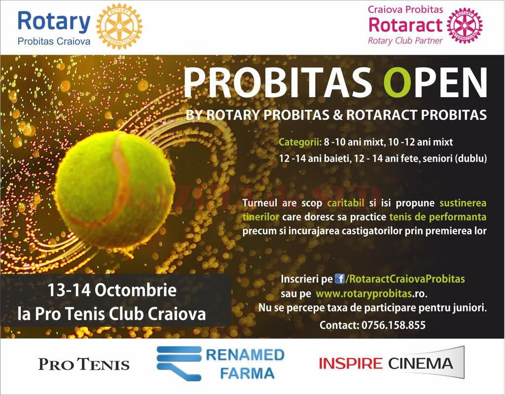 Rotary Craiova Probitas și Rotaract Craiova Probitas organizeaza pe 13-14 Octombrie turneul de tenis Probitas Open. Acesta are scop caritabil și își propune susținerea tinerilor care doresc să practice tenis de performanță precum și încurajarea câștigătorilor prin premierea lor. Turneul are categorii de juniori (simplu) și de seniori (dublu), iar locurile pe tablourile de joc sunt limitate.