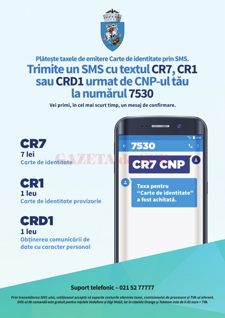 Direcţia de Evidenţă a persoanelor Craiova a anunţat că, din data de 5 octombrie, cetăţenii au posibiltatea să plătească taxele de emitere a actelor de identitate şi furnizarea datelor cu caracter personal prin SMS la numărul 7530 cu următorul text: