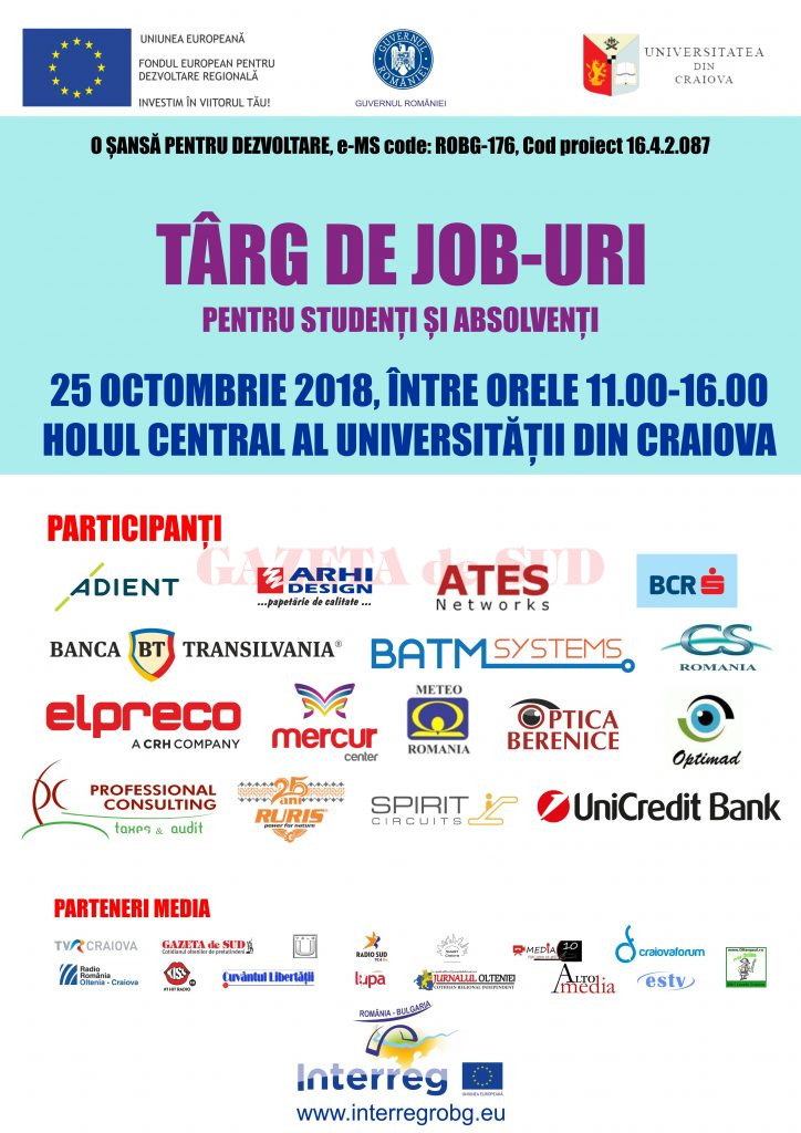 Conducerea Universității din Craiova alături de echipa de management a proiectului transfrontalier „O șansă pentru dezvoltare” vă invită la târgul de joburi joi, 25 octombrie, între orele 11:00-16.00, în Amfiteatrul 219 și holul central al Universității din Craiova. La târgul de joburi și-au anunțat participarea peste 15 firme, companii, institutii, banci, firme de recrutare.