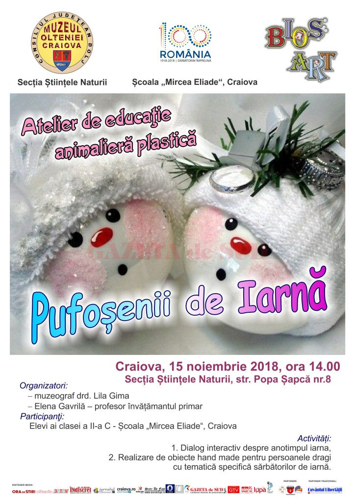 Joi, 15 noiembrie, începând cu ora 14.00, Secţia Ştiinţele Naturii a Muzeului Olteniei organizează în parteneriat cu Școala Generală „Mircea Eliade”, din Craiova, un nou modul al Proiectului cultural-educativ „Bios Art”, atelier de educaţie animalieră plastică, cu titlul „Pufoșenii de Iarnă”!