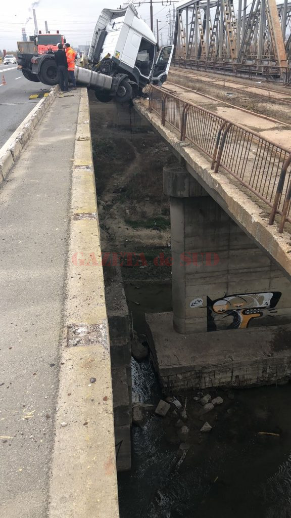 Un cap tractor condus de un tânăr de 28 de ani, a intrat în parapetul de pe marginea Drumului Naţional 6, pe podul de peste râul Amaradia, înainte de combinatul din zona Işalniţa. Şoferul a pierdut controlul volanului, iar în urma impactului, capul tractor a rămas suspendat între podus rutier şi cel feroviar. Potrivit IPJ Dolj, tânărul nu consumase alcool.