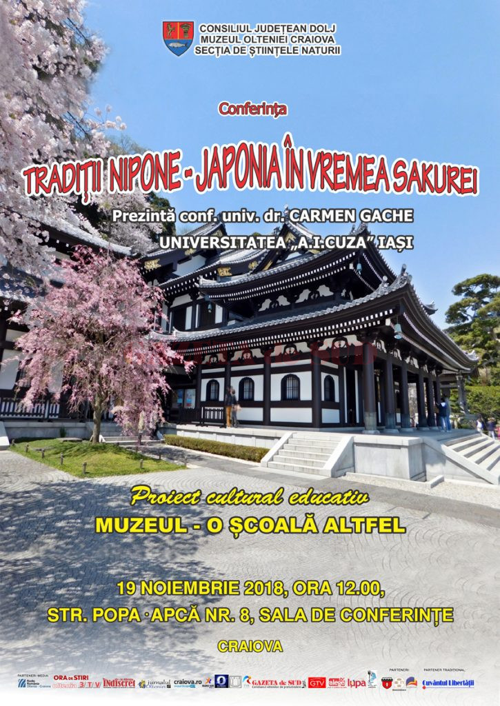 Despre sărbătoarea înfloririi cireșilor și spectacolul florilor de cireș din Japonia, participând, luni, 19 noiembrie, ora 12.00, la sediul Secţiei de Ştiinţele Naturii a Muzeului Olteniei Craiova, din str. Popa Șapcă nr. 8, la conferința „Tradiţii nipone – Japonia în vremea Sakurei”. Evenimentul face parte din proiectul cultural Muzeul – O şcoală altfel, finanțat de Consiliul Județean Dolj.