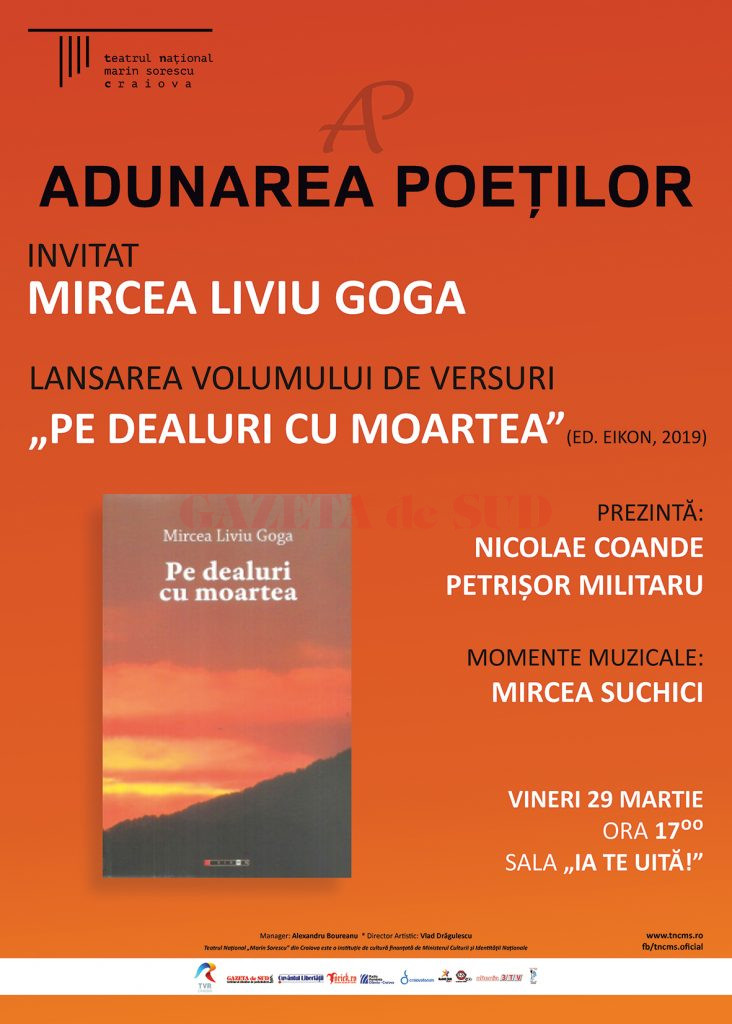Mircea Liviu Goga va lansa, vineri, 29 martie, ora 17.00, la sala Ia te uită!, cea mai recentă carte de poezie, “Pe dealuri cu moartea” (Ed. Eikon, 2019). Prezintă, Nicolae Coande și Petrișor Militaru. Mircea Suchici va oferi câteva momente muzicale în preambulul manifestării.