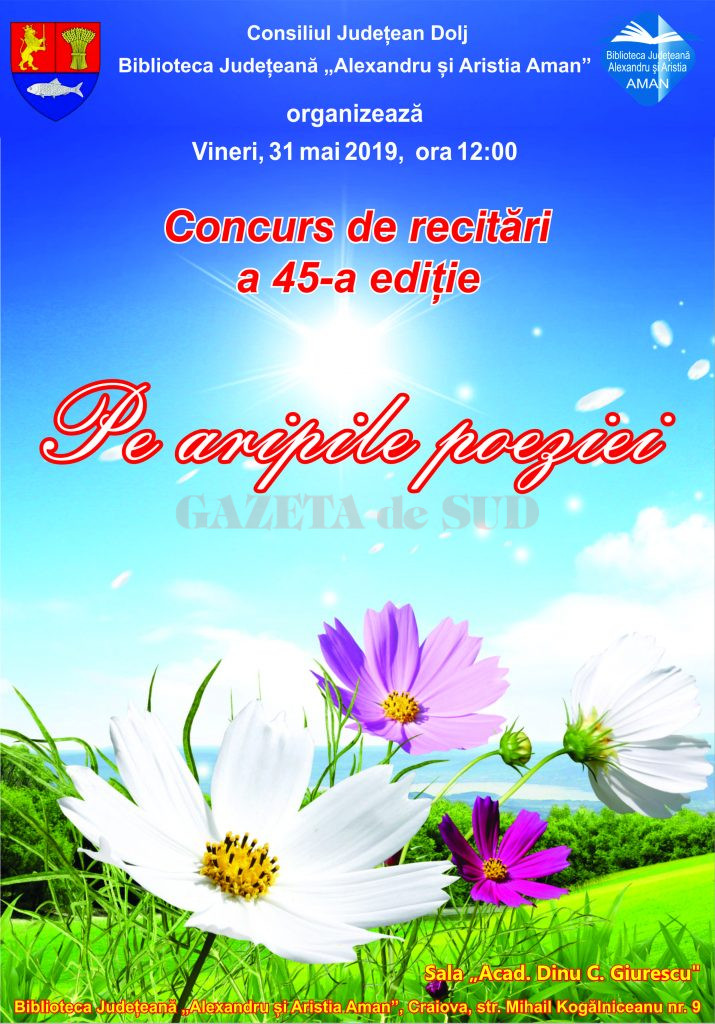 Biblioteca Județeană „Alexandru și Aristia Aman” organizează vineri, 31 mai 2019, începând cu ora 12:00, în sala „Acad. Dinu C. Giurescu”, ediția 45 a concursului de recitări „Pe aripile poeziei”.