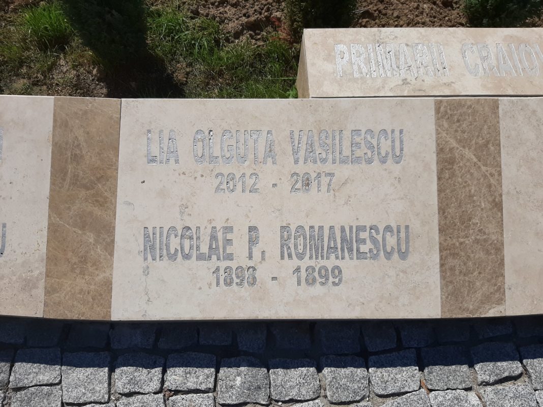 În continuare, ni se spune că inscripţionarea postamentului s-a făcut “prin dispunerea numelor primarilor în ordinea cronologică a mandatelor de primar”. Acest lucru l-am constatat şi noi, însă ultimele trei plăcuţe din dreapta postamentului nu au fost inscripţionate. Cei trei primari care ar fi trebuit menţionaţi pe rândul de jos al plăcuţelor libere (în dreapta) au fost trecuţi pe rândul se sus (în stânga), astfel că Olguţa Vasilescu a ajuns să se suprapună cu Nicolae Romanescu. GdS a realizat şi un scurt filmuleţ în care arătam că dacă plăcuţele lăsate libere ar fi fost inscripţionate Olguţa Vasilescu s-ar fi suprapus cu Ulysse Boldescu, primar în perioada 1890 – 1893. GdS a realizat şi un scurt filmuleţ, în care a arătat acest lucru.