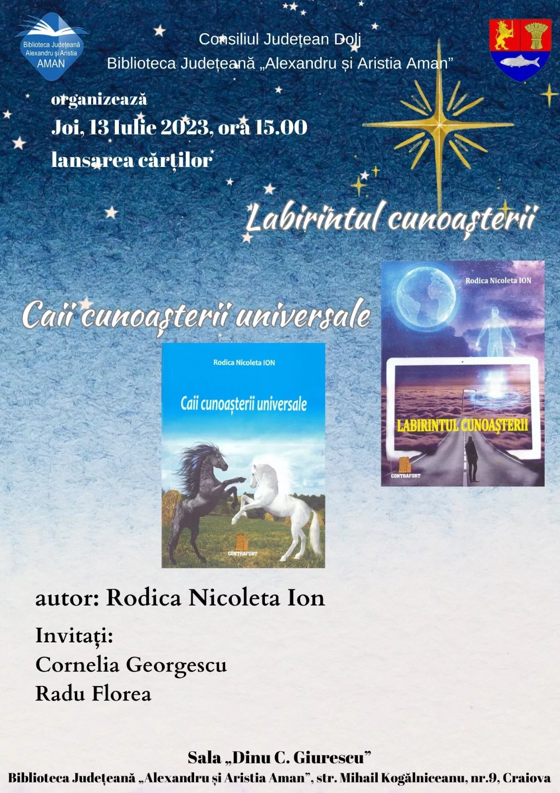 Biblioteca „Alexandru și Aristia Aman” găzduiește joi, lansare volumelor „Labirintul cunoașterii” și „Caii cunoașterii universale”, autor Rodica Nicoleta Ion.