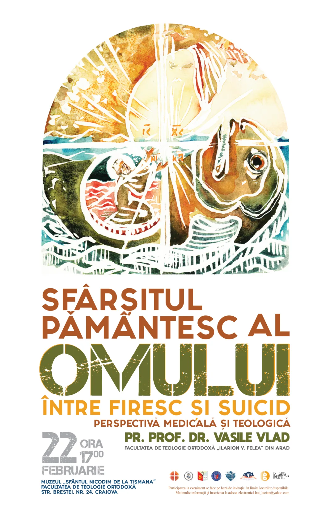 Prelegerea va fi susținută de pr. prof. univ. dr. Vasile Vlad, cadru didactic la Facultatea de Teologie Ortodoxă „Ilarion V. Felea” din Arad. Dezbaterea se va purta în jurul chestiunilor legate de sfârșitul pământesc al omului.