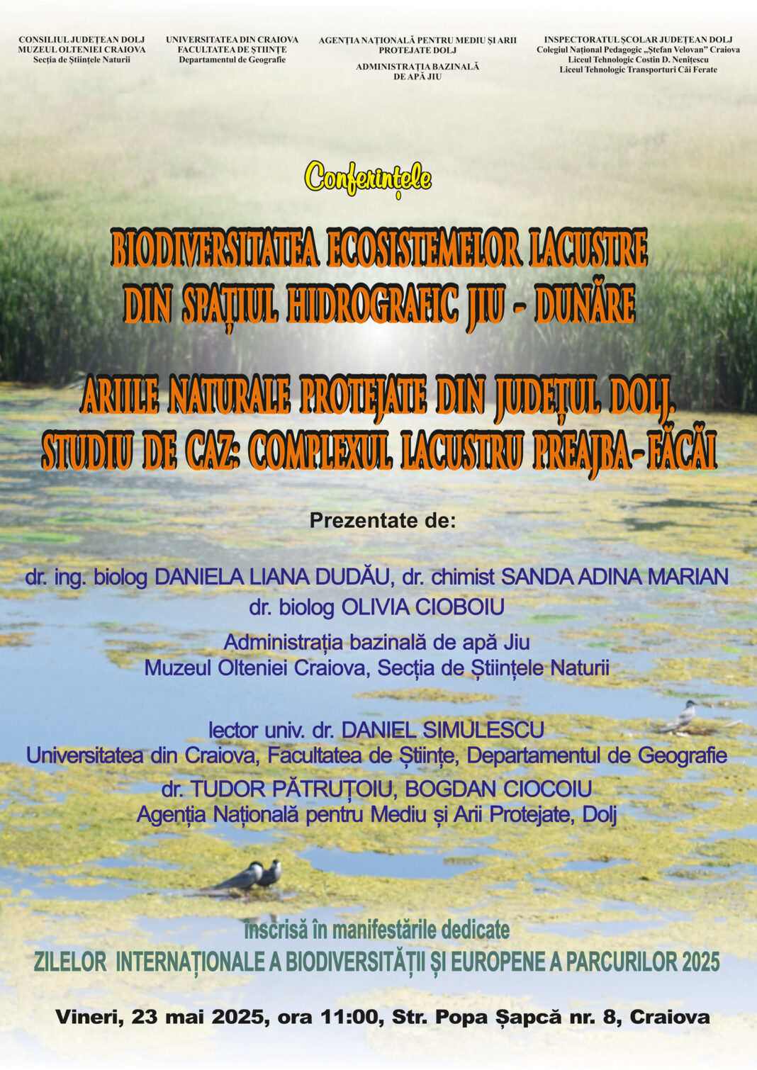 În acest context, Secţia de Ştiinţele Naturii a Muzeului Olteniei Craiova continuând seria manifestărilor înscrise în cadrul proiectului cultural-educativ Mediul și Universul, promovează aceste evenimente prin prezentarea conferințelor Biodiversitatea ecosistemelor lacustre din spațiul hidrografic Jiu-Dunăre și Ariile naturale protejate din județul Dolj.