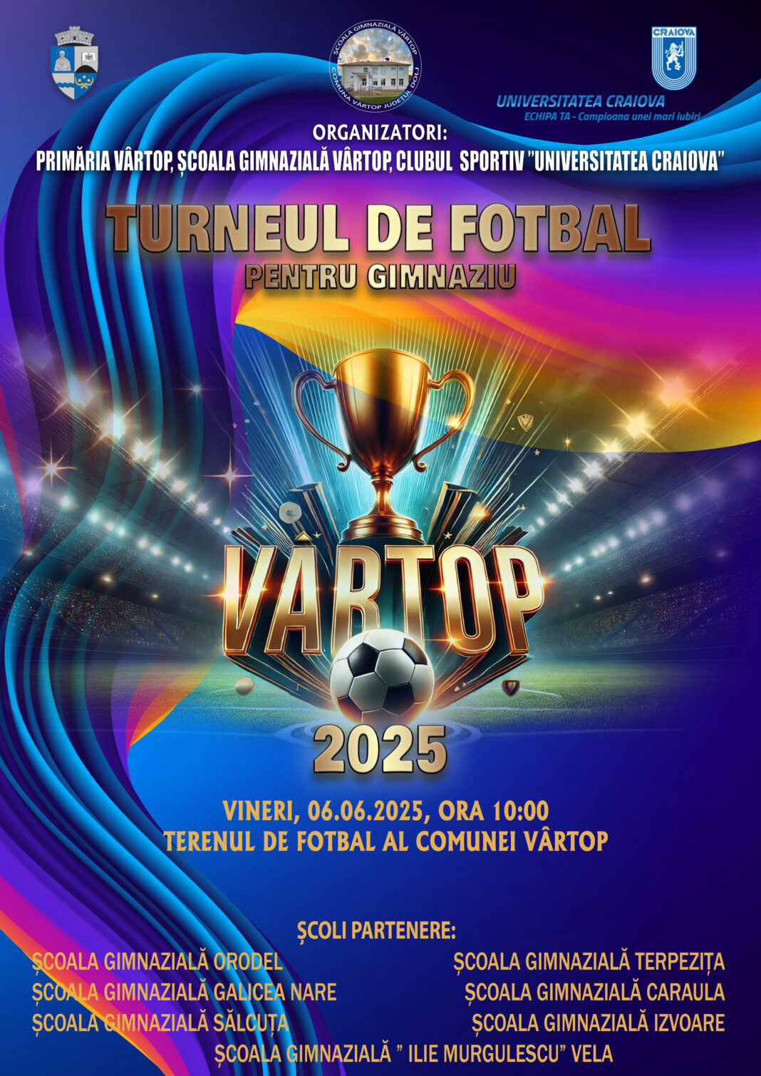 Școala Gimnazială Vârtop va organiza, vineri, un miniturneu de fotbal pentru elevii de gimnaziu. Competiția este organizată în colaborare cu Primăria Vârtop și CS Universitatea Craiova.