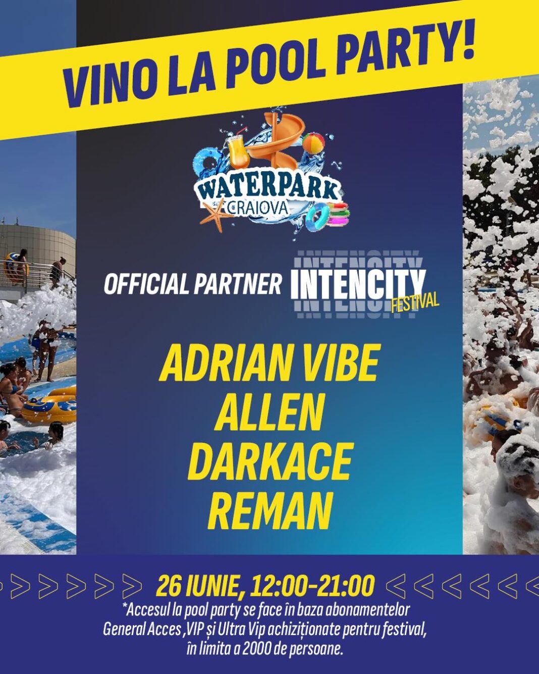 Joi, 26 iunie, festivalul debutează în forță încă din timpul zilei, cu un eveniment exclusivist care aduce atmosfera de vacanță în mijlocul orașului: pool party-ul oficial IntenCity, organizat la Water Park Craiova între orele 12.00 și 21.00. Pe ritmurile a patru DJ electrizanți – Adrian Vibe, Allen, Darkace și ReMan – participanții se vor bucura de muzică, spumă, soare și distracție fără oprire.