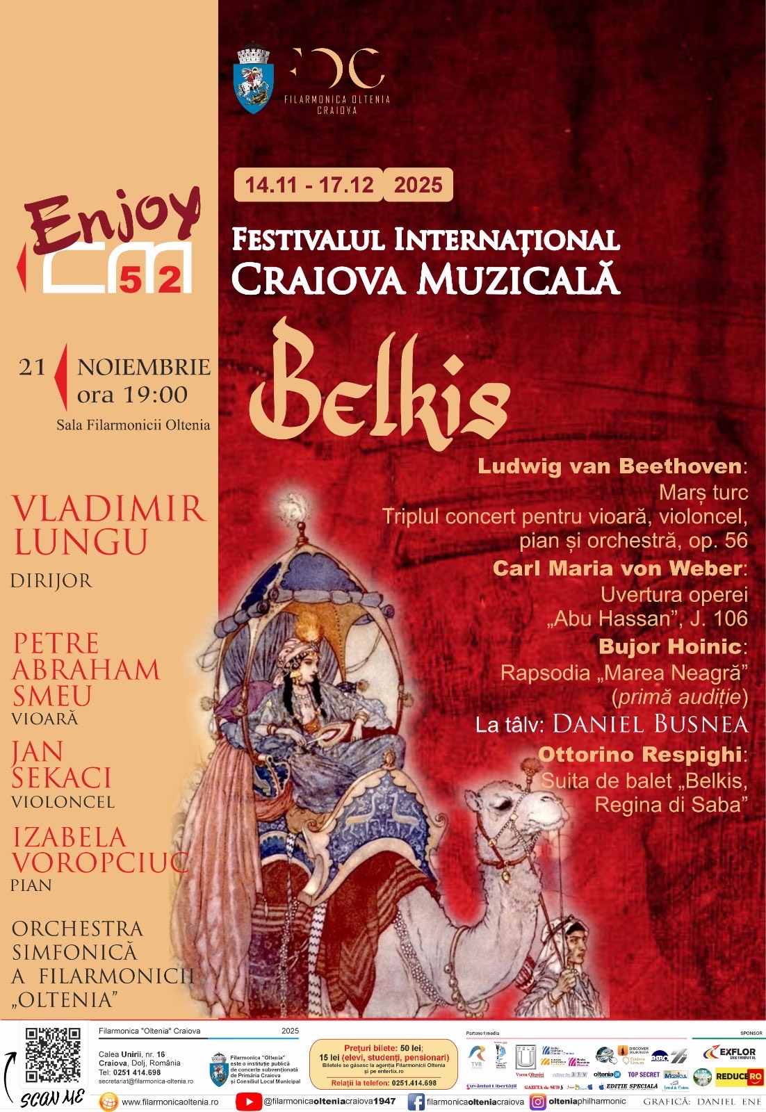 Festivalul Internațional Craiova Muzicală aduce publicului o seară rară, în care legenda și muzica devin punți culturale. În centrul atenției se află suita de balet Belkis, Regina din Saba de Respighi – o poveste fascinantă, în care misterioasa regină din regatul Saba (Yemenul de azi) vizitează palatul lui Solomon, fiind un simbol al inteligenței, puterii și seducției orientale. Respighi transformă această legendă într-un spectacol orchestral luxuriant, plin de ritmuri ceremoniale, dansuri sonore și culori care evocă farmecul Orientului.