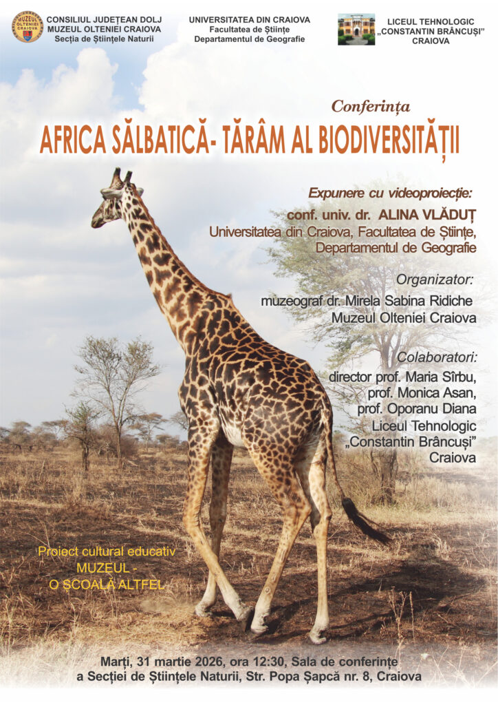 Publicul din Craiova este invitat la o conferință captivantă dedicată biodiversității africane, intitulată „Africa sălbatică – tărâm al biodiversității”.