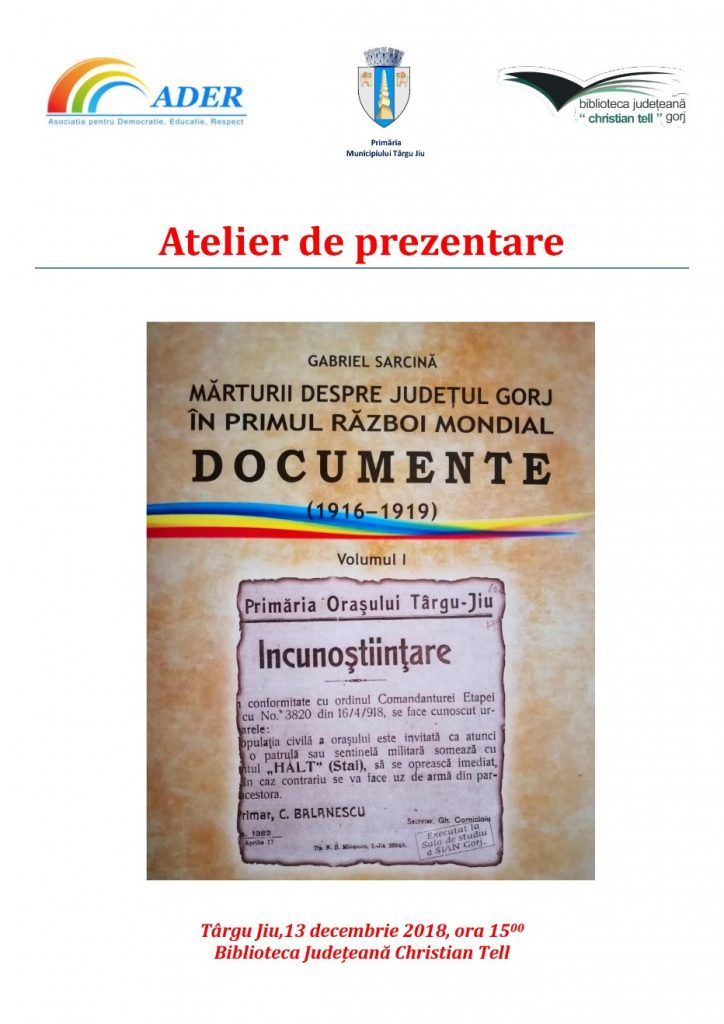 Asociația pentru Democrație, Educație, Respect (ADER) organizează joi 13 decembrie, de la ora 15,00, la Biblioteca Județeană „Christian Tell”, din Târgu Jiu, prezentarea cărții istoricului Gabriel Sarcină, Mărturii despre Județul Gorj în primul război mondial. Documente (1916-1919). Este vorba de o lucrare de peste 700 de pagini care adună între copertele sale 967 de documente aflate în custodia Serviciului Județean Gorj al Arhivelor Naționale. Volumul de documente apărut sub egida Societății de Științe Istorice din România – Filiala Gorj, la Editura Măiastra, în anul 2018, reprezintă un instrument util cercetării istorice putând fi folosit de toți cei care sunt interesați de reconstituirea trecutului localităților gorjene precum și de personalități locale din perioada primului război mondial.