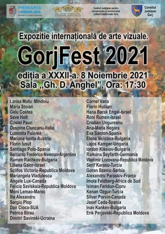 Ediția a XXXII-a a GORJFEST 2021 continuă la Sala „Gh. D. Anghel” a Palatului Culturii din Drobeta Turnu-Severin Severin cu vernisarea unei expoziții internaționale, luni, 8 noiembrie, începând cu ora 17.30.
