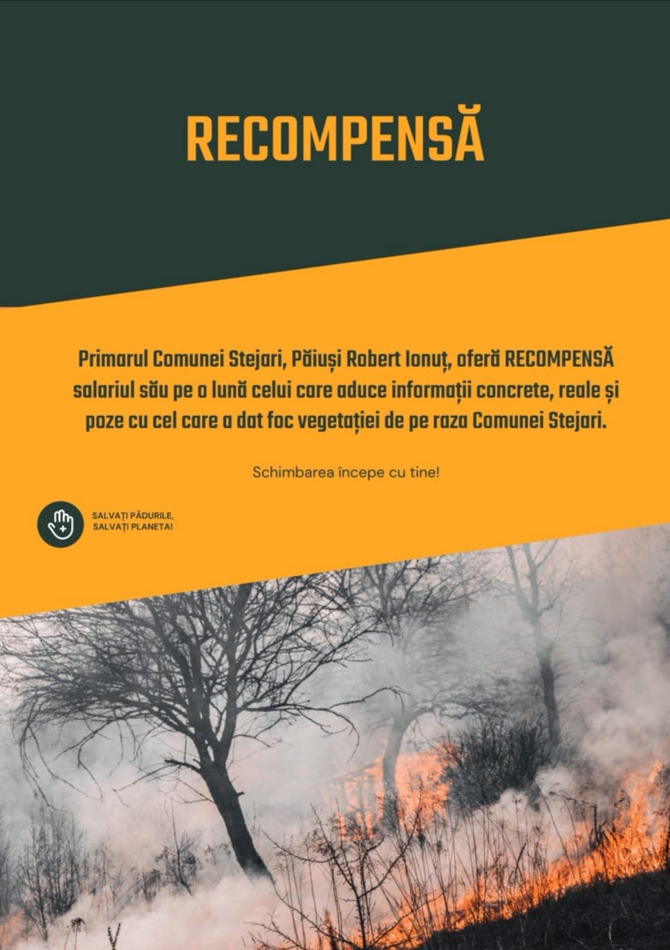 Primarul din Stejari din Gorj a anunțat că oferă recompensă celui care aduce informații concrete și reale (cu poze) despre cel care a dat foc vegetației de pe raza comunei. Recompensa e substanțială, adică salariul primarului pe o lună (aproximativ 5.000 de lei).