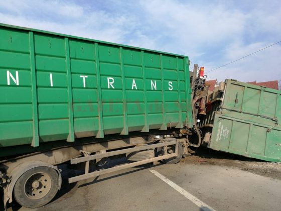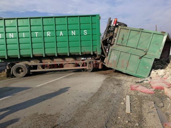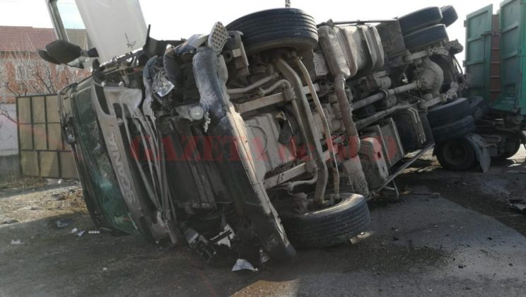 Autocamionul transporta furaje pentru păsări. Șoferul tirului, în vârstă de 48 de ani, din Ocna Sibiului, a fost găsit conștient, cu dureri la membrul inferior stâng.