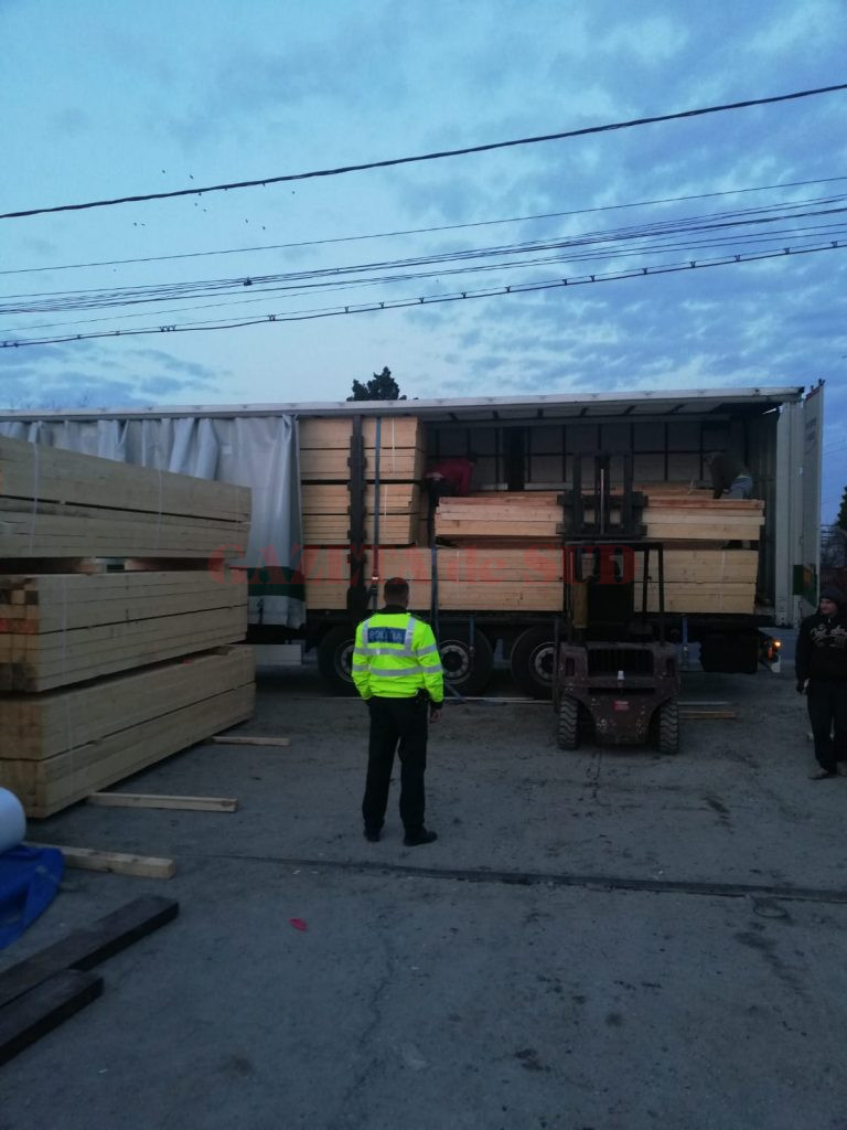 Astfel, noaptea trecută, aceştia au depistat în trafic, pe raza localităţii Pleşoiu, un ansamblul de vehicule, care transporta material lemnos.