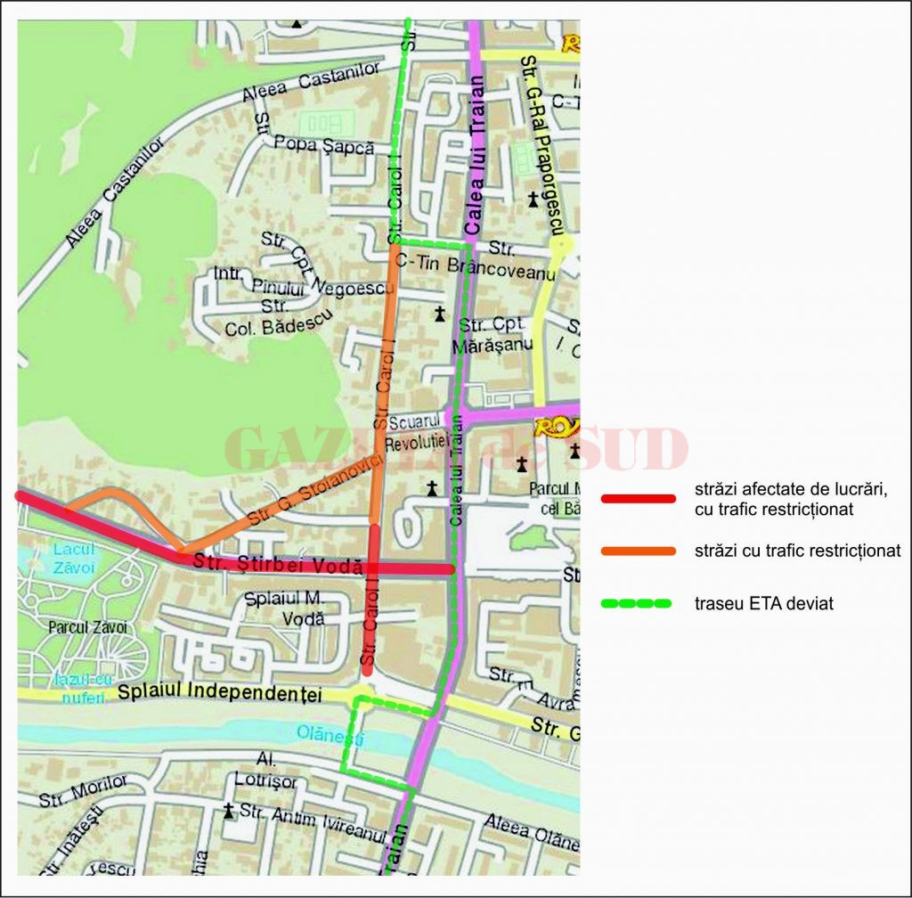 Întrucât ultimele prognoze meteo arată o îmbunătăţire a vremii, începând de la miezul nopţii de joi spre vineri, în zona centrală a Râmnicului vor începe asfaltările pe străzile Ştirbei Vodă şi Carol I. Drept urmare, de joi, 22 noiembrie, ora 24.00, şi până marţi, 27 noiembrie, ora 22.00, vor fi restricţionate traficului auto străzile Ştirbei Vodă (de la intersecţia cu Calea lui Traian până la intersecţia cu splaiul Independenţei), Carol I (de la intersecţia cu str. Constantin Brâncoveanu până la intersecţia cu splaiul Independenţei), Gabriel Stoianovici (pe toată lungimea) şi Maior Georgescu (pe toată lungimea). În acelaşi interval de timp, SC ETA SA va modifica traseele mai multor linii care treceau pe str. Carol I, autobuzele urmând să circule pe ruta Carol I – str. Constantin Brâncoveanu – Calea lui Traian – splaiul Independenţei – pod Carol I – al. Doru Chiriţă – Calea lui Traian. De asemenea, staţia din spatele River Plaza Mall de pe str. Carol I se va muta temporar la intersecţia străzii Carol I cu splaiul Independenţei (zona sensului giratoriu).