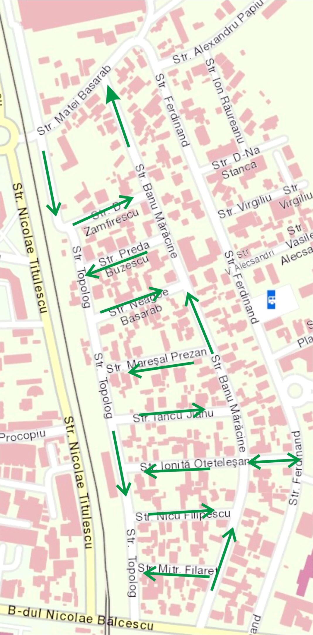 • Strada Banu Mărăcine: sens Sud – Nord (dinspre Bulevardul Nicolae Bălcescu spre strada Matei Basarab);